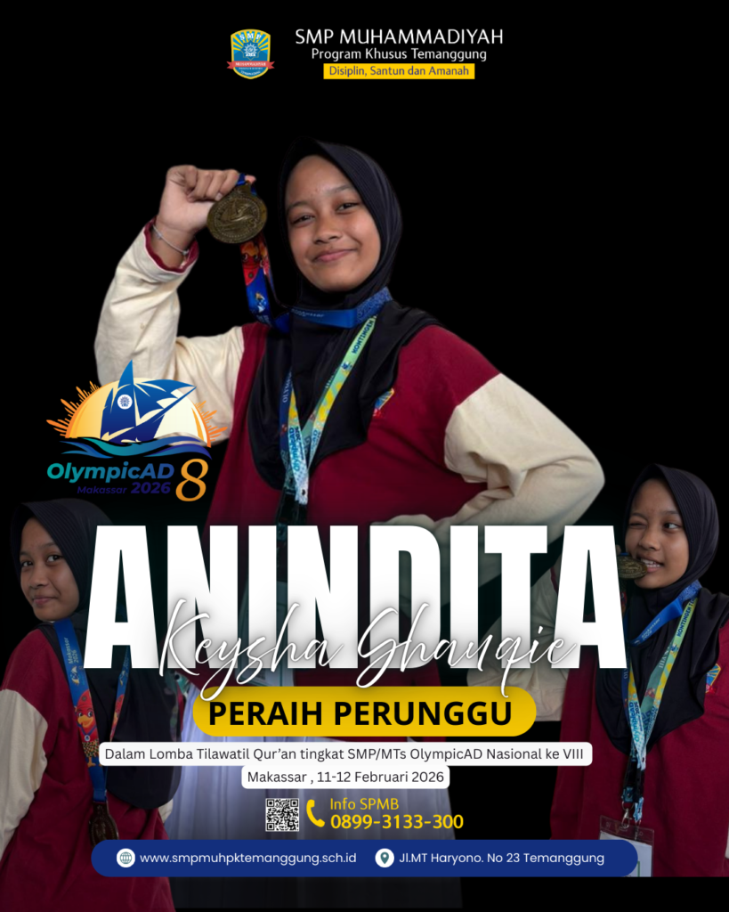 Anindita Kheisya Syauqie, siswi kelas VII SMP Muhammadiyah Program Khusus, berhasil menorehkan prestasi membanggakan dengan meraih Medali Perunggu dalam ajang OlympicAD 2026 cabang Lomba Tilawah. Prestasi ini menjadi bukti nyata dari kerja keras, ketekunan, serta semangat belajar yang tinggi dalam mengembangkan potensi akademiknya.